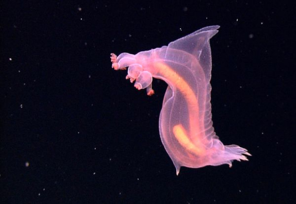 据美国国家海洋与大气管理局专家介绍,在这张拍摄于7月27日的“壮观”照片中,一个自由游动的海参在10515英尺(约合3205米)深海底的冰冷海水中穿行。全世界已知的海参有1250种,它们以其独特的外形命名,或生活在海底或海底附近,或栖息于浅滩。一旦受到威胁,有些会释放出有粘性的细丝诱捕敌人。有些则将“自残”作为一种防卫机制:它们剧烈收缩肌肉,从肛门中喷射出一些内脏。当时机成熟,很快再生新的内脏。
